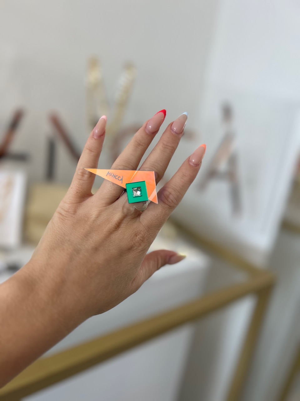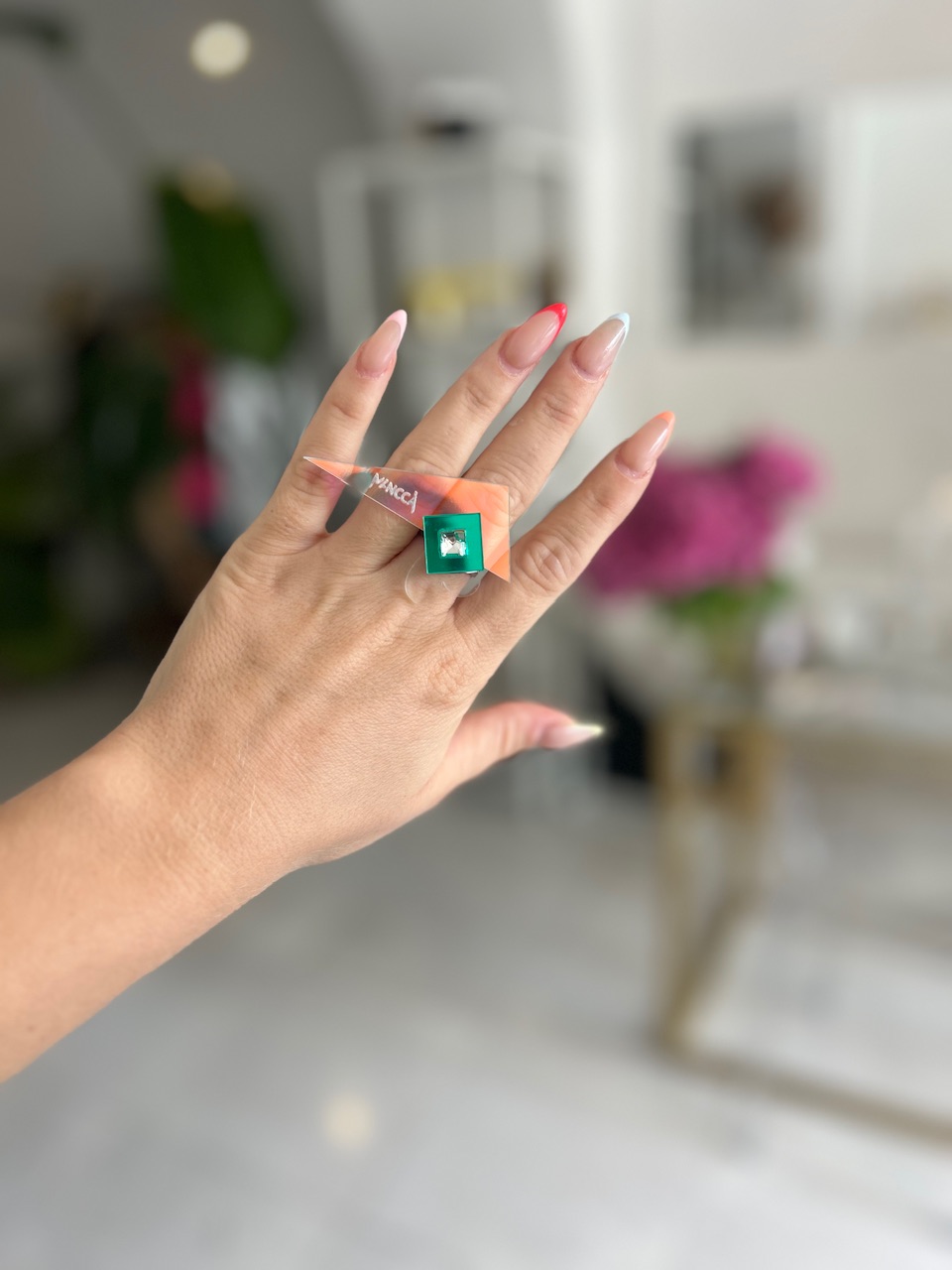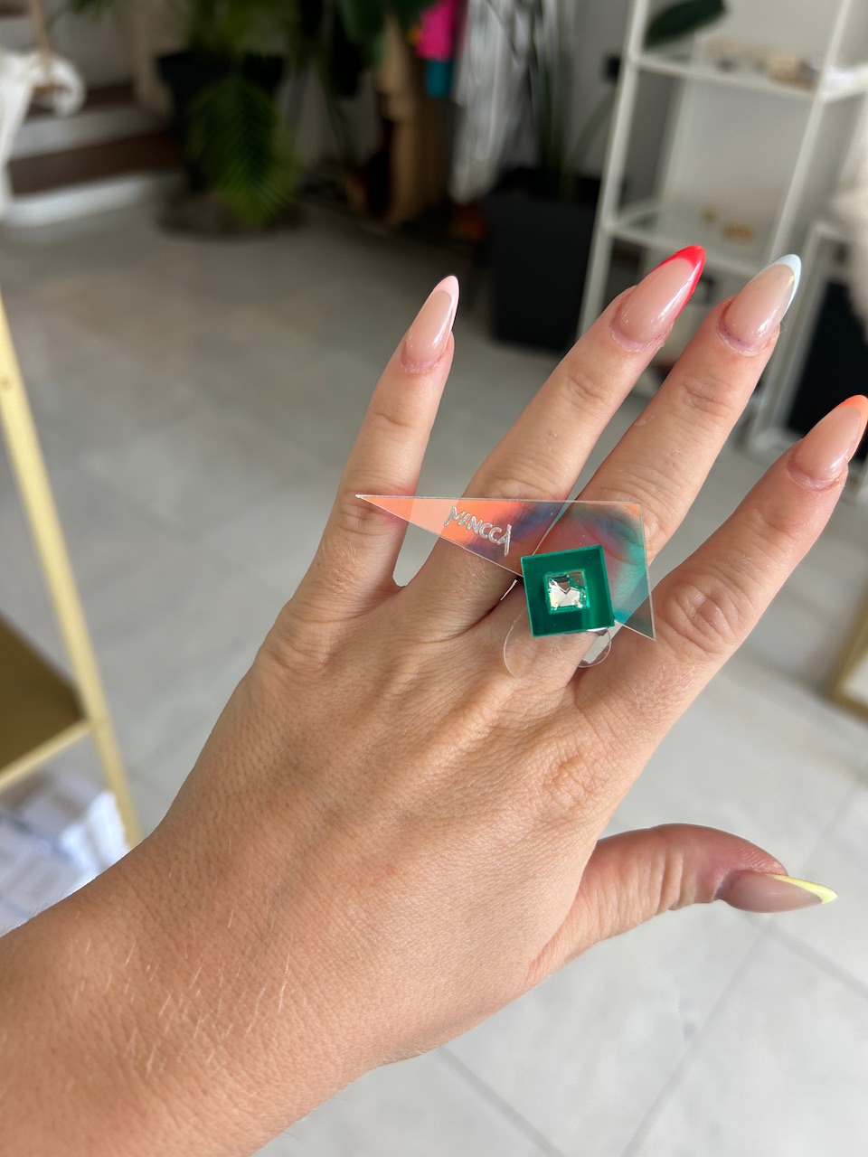 Kombinacija holograf, zelene in prozorne ter kristala, deluje zelo sveže! Prstan je kot nalašč za top stajliš kombinacije. Nor in eleganten statement kos, ki bo gotovo požel ogromno komplimentov. Izstopa z unikatnim dizajnom in kristali. Bodi drzna in si privošči drugačen kos nakita. Nora kombinacija je kot nalašč za poletne stajlinge.