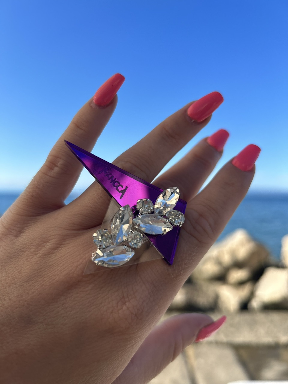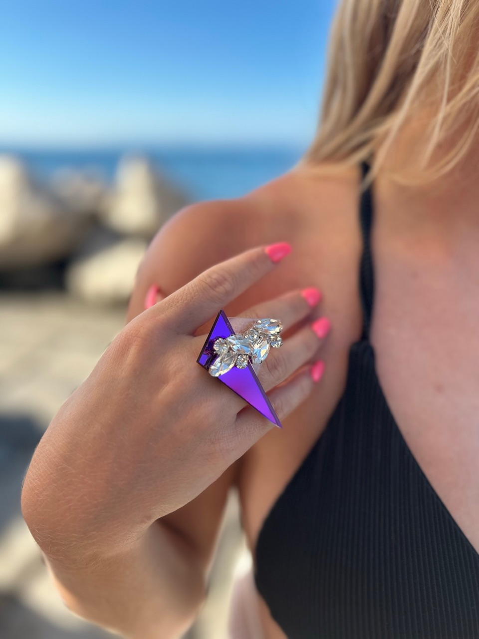 Prozoren in mirror vijola prstan je kot nalašč za top stajliš kombinacije. Nor in eleganten statement kos, ki bo gotovo požel ogromno komplimentov. Izstopa z unikatnim dizajnom in kristali. Bodi drzna in si privošči drugačen kos nakita. Nora mirror vijola bo kradla poglede 💜