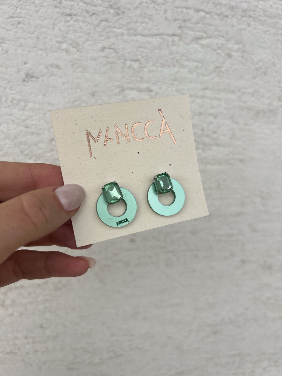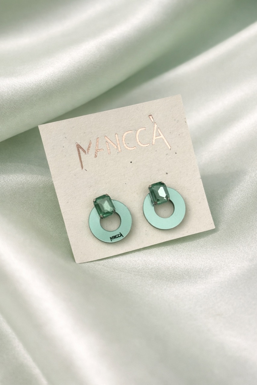 MINI Uhani round – uhani na pistacija zeleni podlagi z dodatkom dveh večjih nežno zelenih kristalov za vsak dan ali posebno priložnost. Enostaven design in odbit look. Odlično gredo v komplet s prstanom PISTACHIO