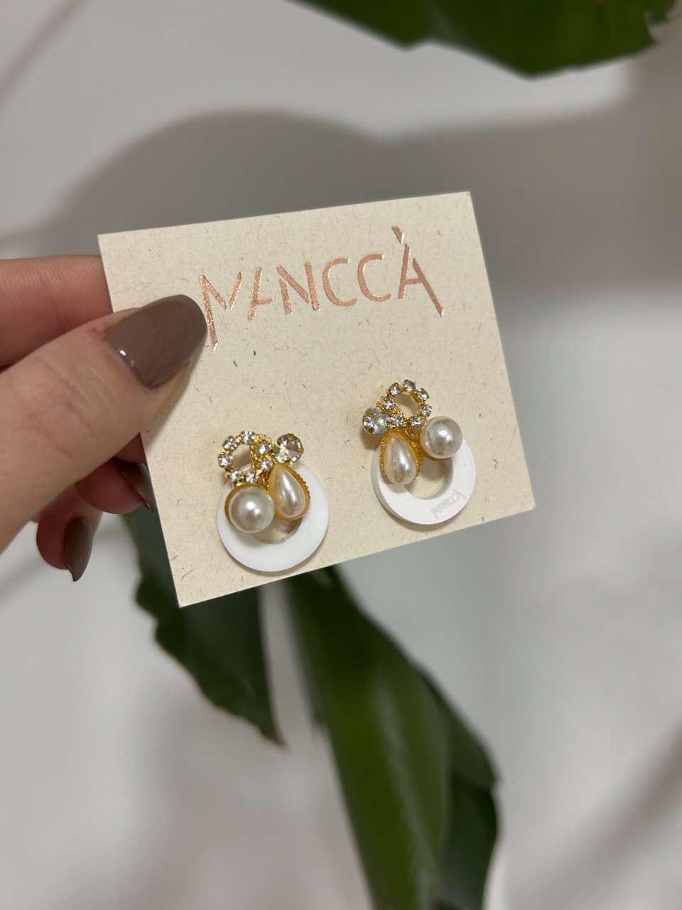 MINI Uhani round – uhani na beli podlagi z dodatkom dveh večjih zlatih kristalov in perl za vsak dan ali posebno priložnost. Enostaven design in odbit look. Poživite svoj look.