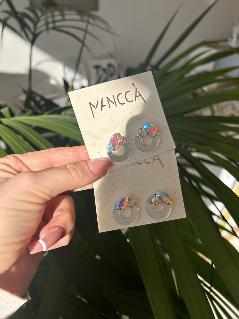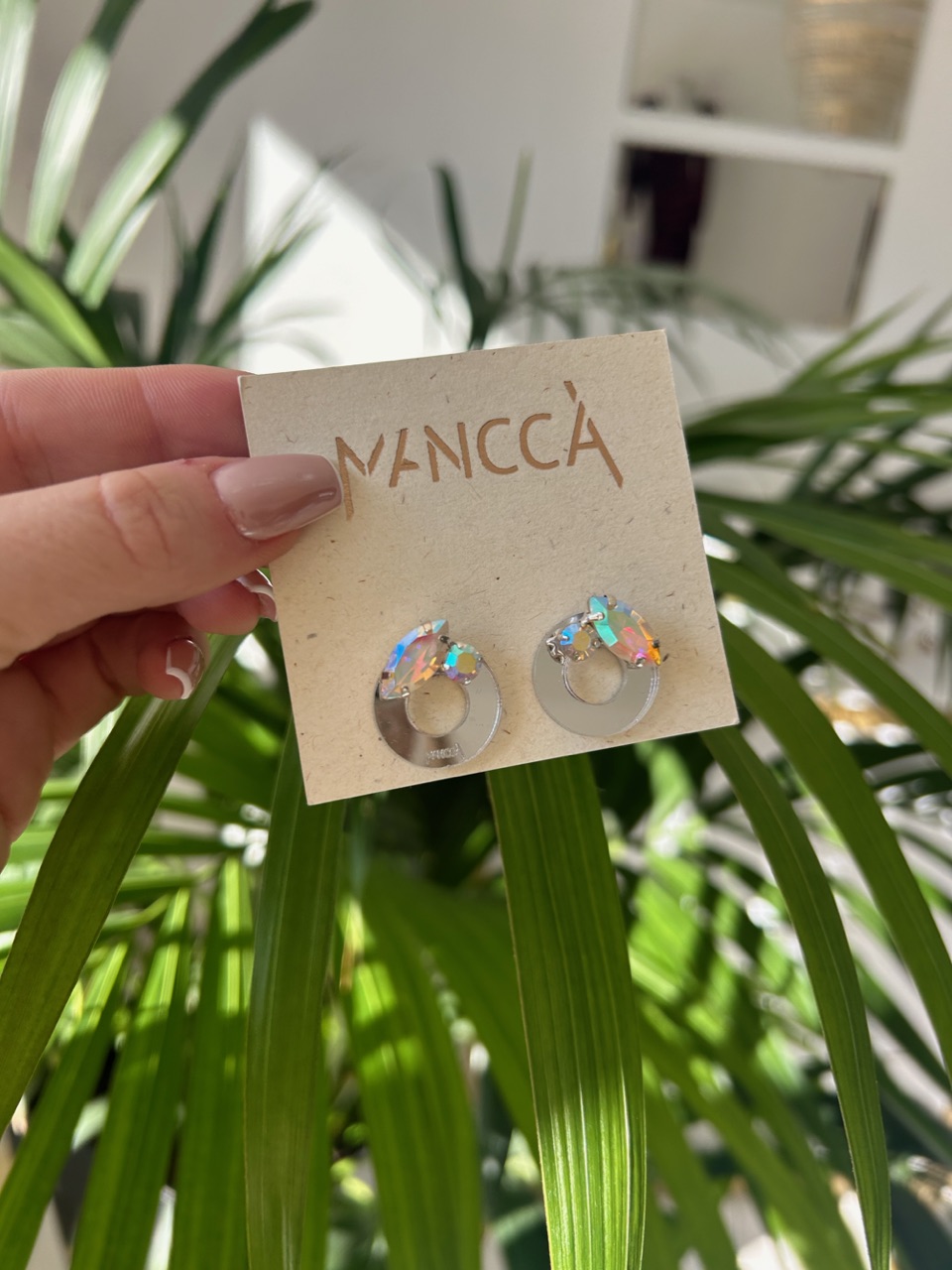 MINI Uhani round – uhani na mirror podlagi z dodatkom dveh večjih prelivajočih barvnih kristalov za vsak dan ali posebno priložnost. Enostaven design in odbit look. Poživite svoj look.