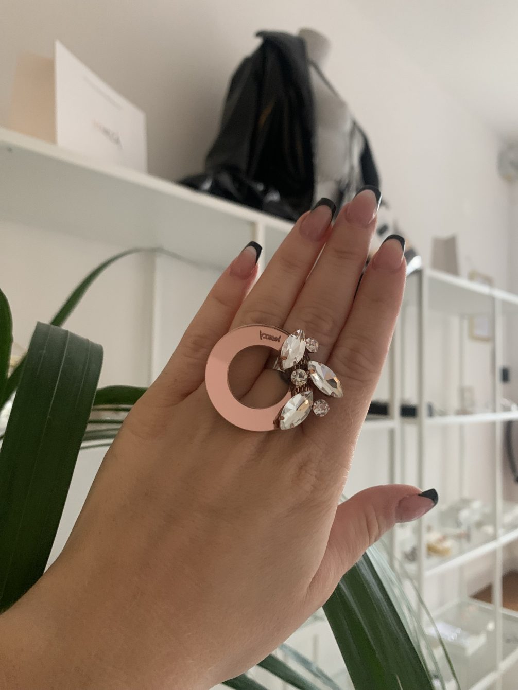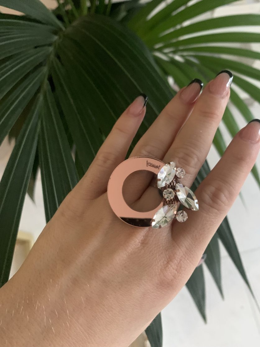 Prstan s kristali, namenjen ljubiteljicam okroglih linij in mirror/rosegold/pink odtenkov. Prstan round ima premer 3,5cm in je obogaten z večjimi belo/prozornimi kristali.