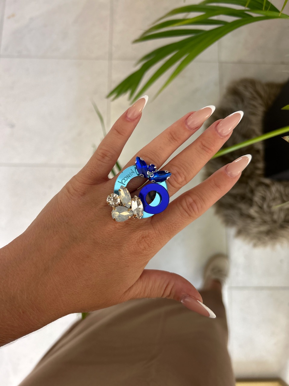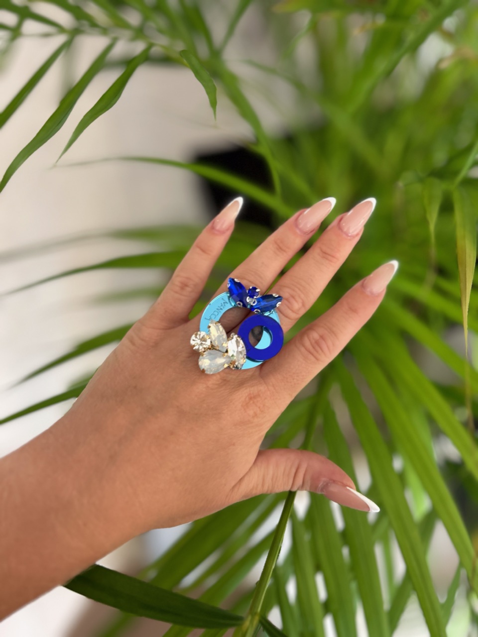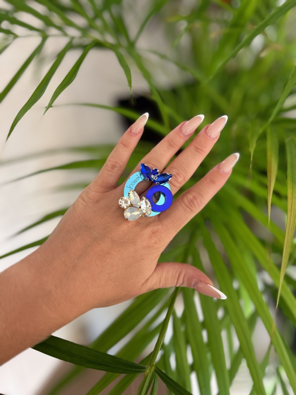 Prstan s kristali na mirror svetlo modri podlagi, namenjen ljubiteljicam okroglih linij in temno modrih odtenkov. Prstan round ima premer 3,5cm in je obogaten z večjimi kristali.