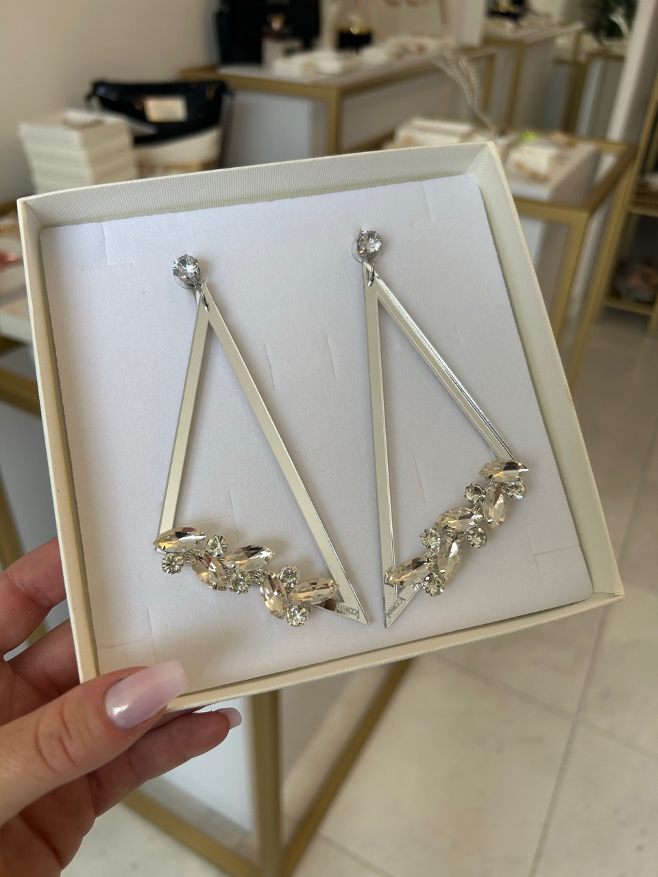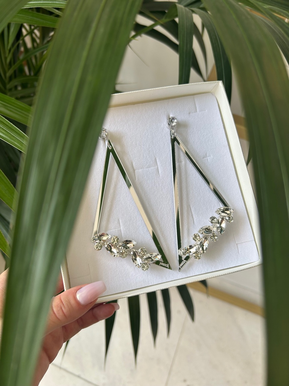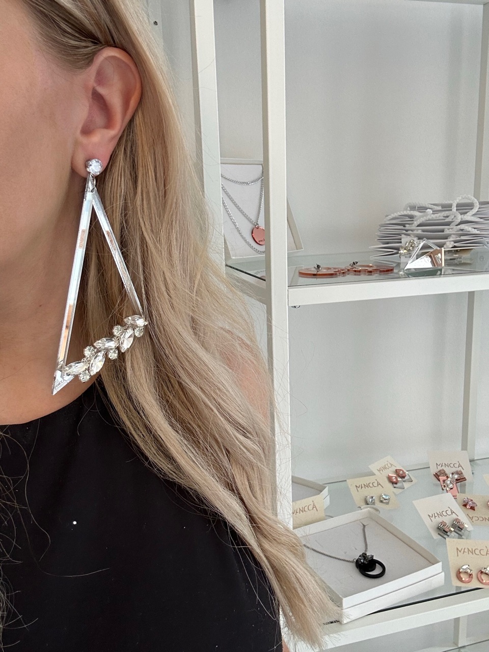 Srebrni mirror uhani v trikotni obliki, za vsak dan ali za posebno priložnost. Kombiniraj jih k casual outfitom ali k bolj odbitim lookom. Super se podajo tudi na odprte zgornje dele in krajše in spete lase, saj res zasijejo. Lahko pa namesto v paru nosite samo enega. Z dodatkom srebrnih kristalov je vse skupaj še bolj glamurozno. V kolikor bi uhane želela v kakšni drugi barvi nam piši na info@studio-mancca.com in ti jih z veseljem pripravimo.