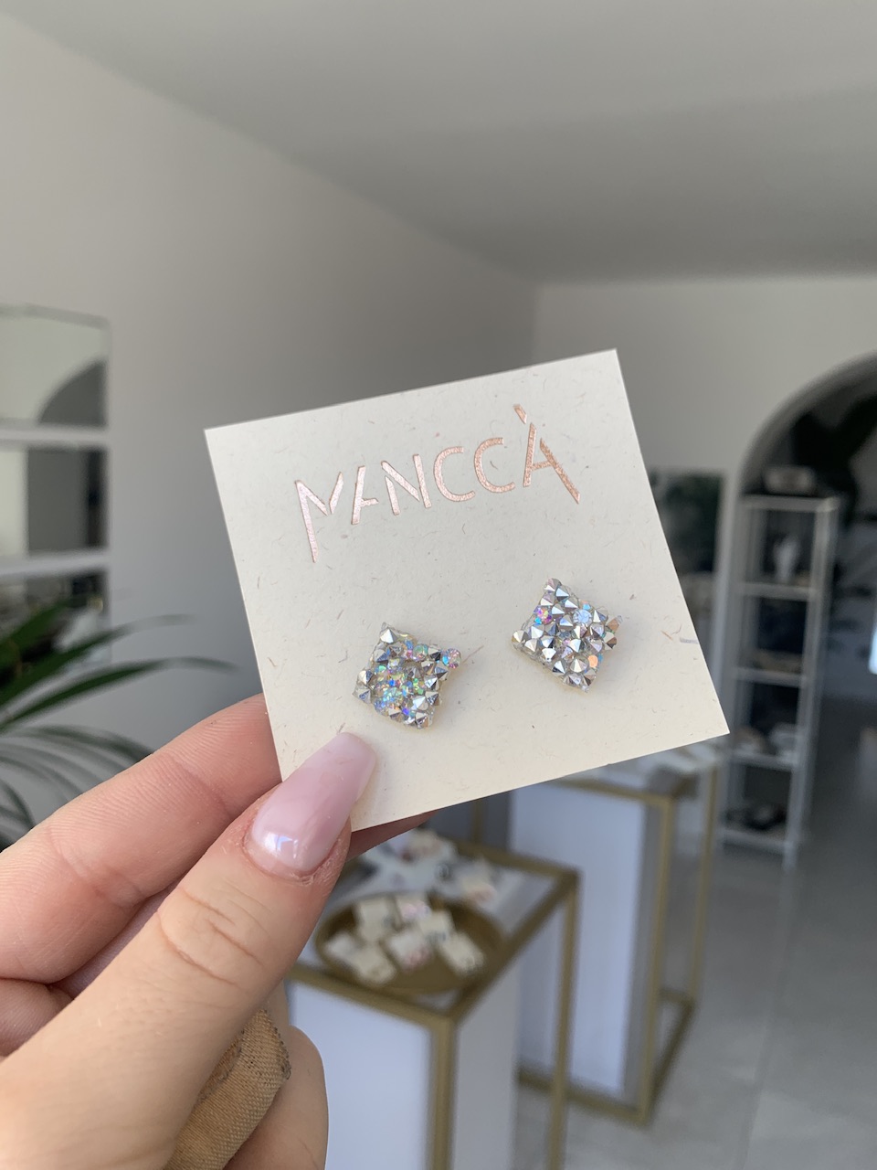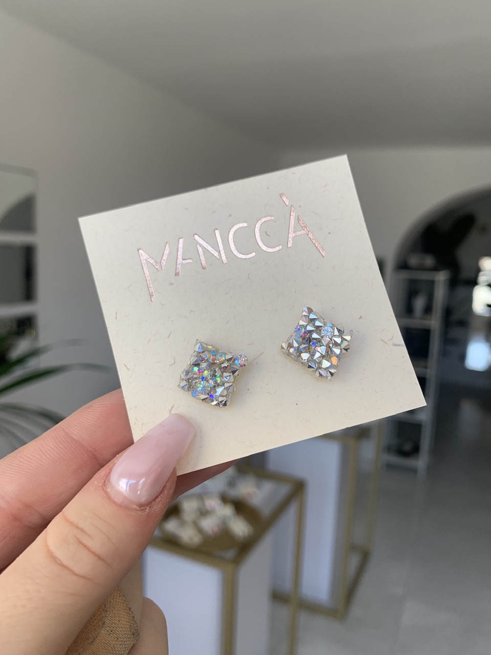 Material: pleksi steklo 3mm, jekleni zaključki, kristali na silikonski podlagi