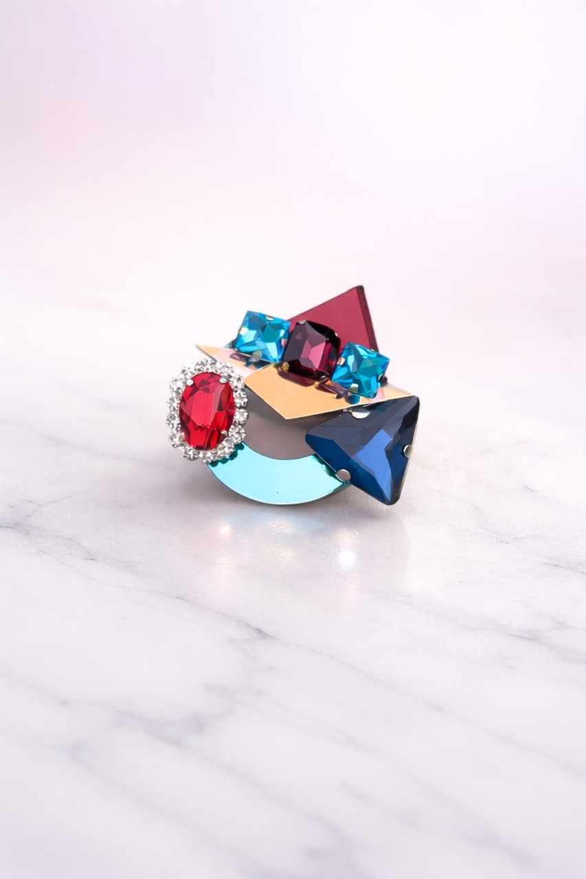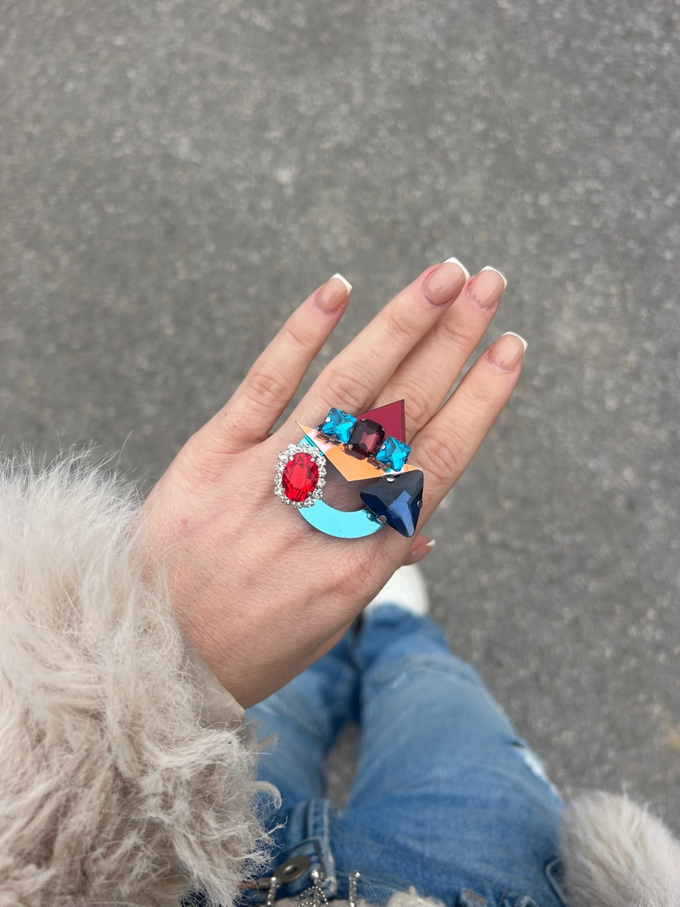 Kombinacija temno modre, turkizne in rdeče, deluje zelo kraljevo! Prstan je kot nalašč za top stajliš kombinacije. Nor in eleganten statement kos, ki bo gotovo požel ogromno komplimentov. Izstopa z unikatnim dizajnom in kristali. Bodi drzna in si privošči drugačen kos nakita. Nora kombinacija je kot nalašč za jesenske stajlinge. Premer 3,5cm.