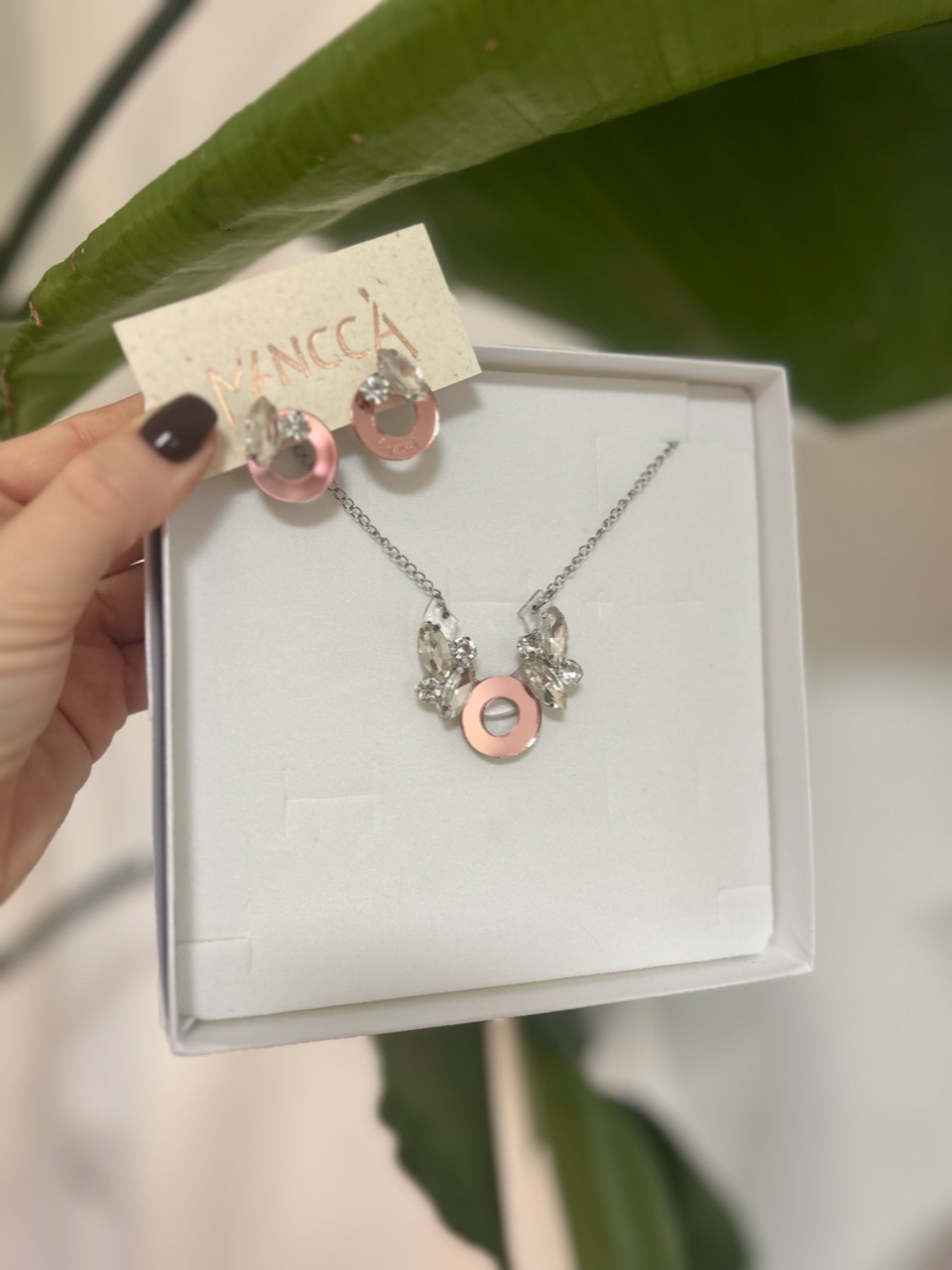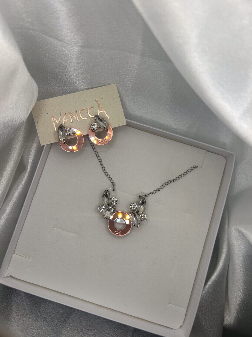 Komplet BOGINJA je sestavljen iz uhanov ter ogrlice na rosegold mirror podlagi v kombinaciji s srebrno verigo in kristali. Želiš biti drugačna? Potem je tale komplet narejen zate. Izstopaj in izrazi svojo unikatnost. Dodaj svojemu outfitu piko na i, saj komplet lahko nosiš za vse priložnosti od porok do vsakodnevnih outfitov.