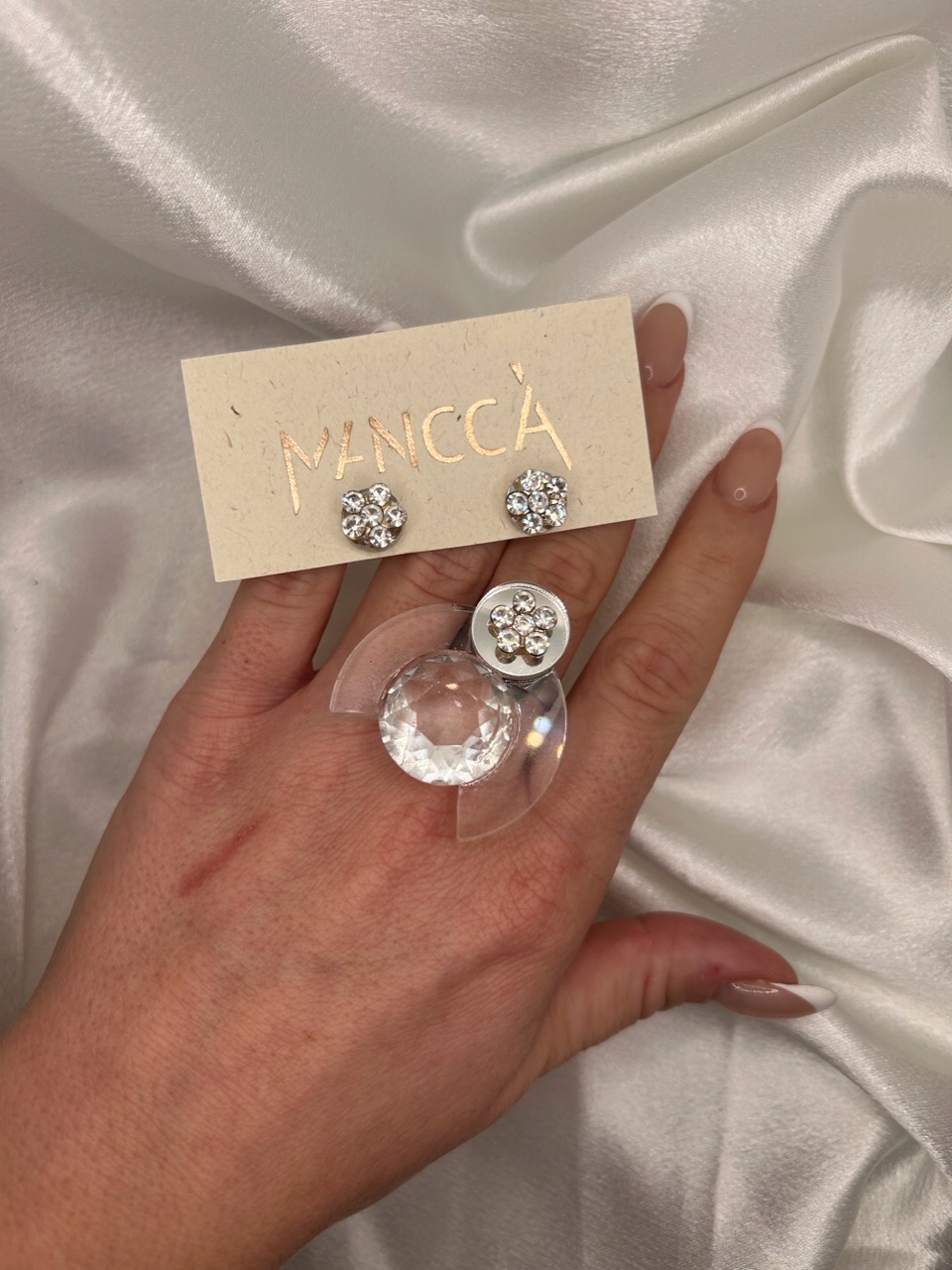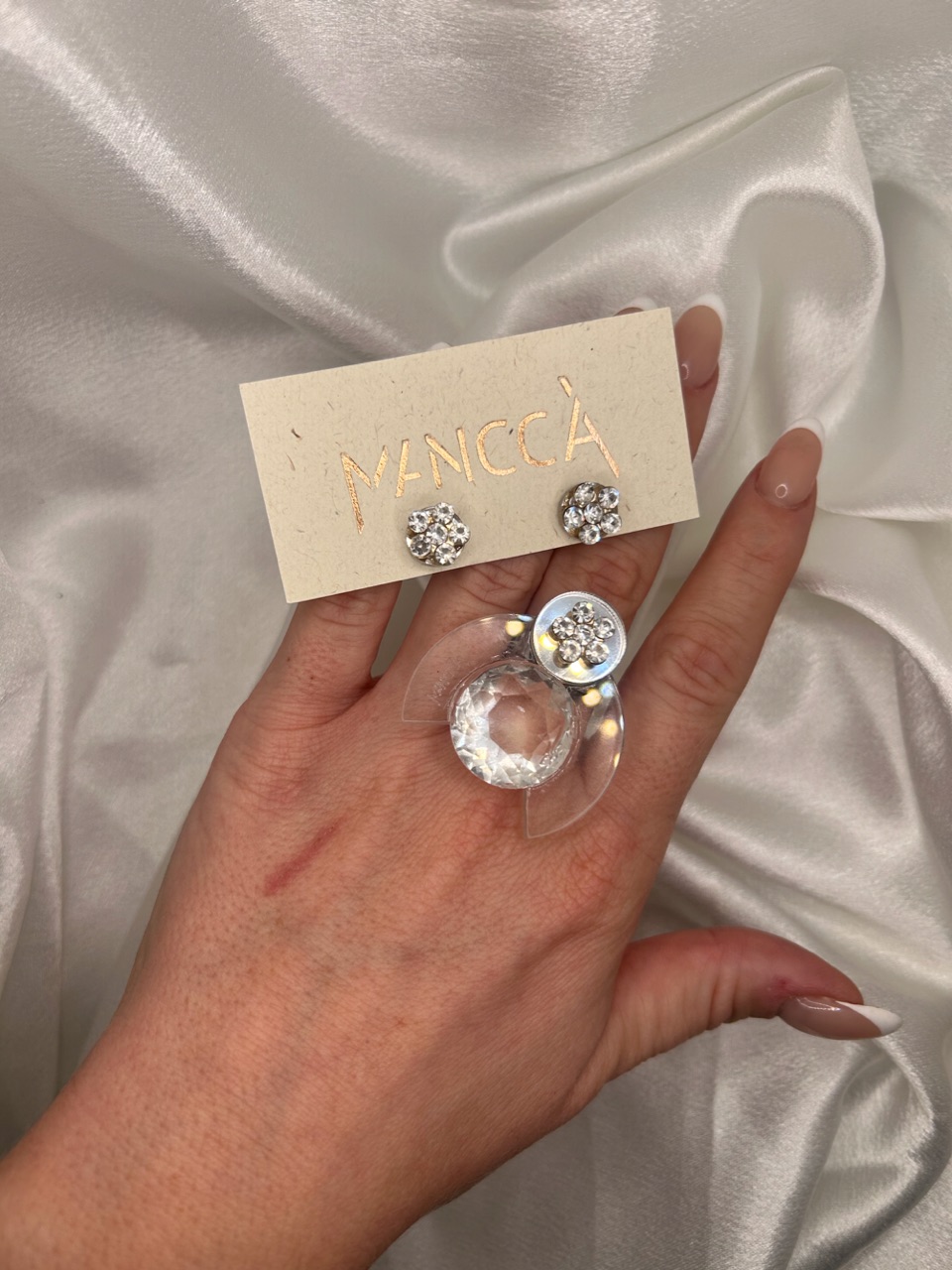 Materiali: pleksi steklo 3mm, umetni kristali, jekleni zaključki. Velikost uhanov je 1cm. Prstan premer cca 3c,5m, standarden obroček z možnostjo reguliranja.