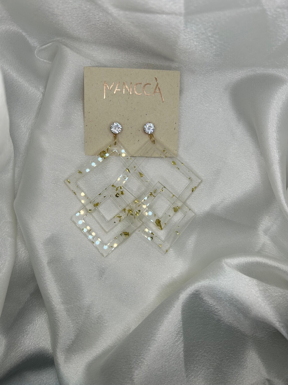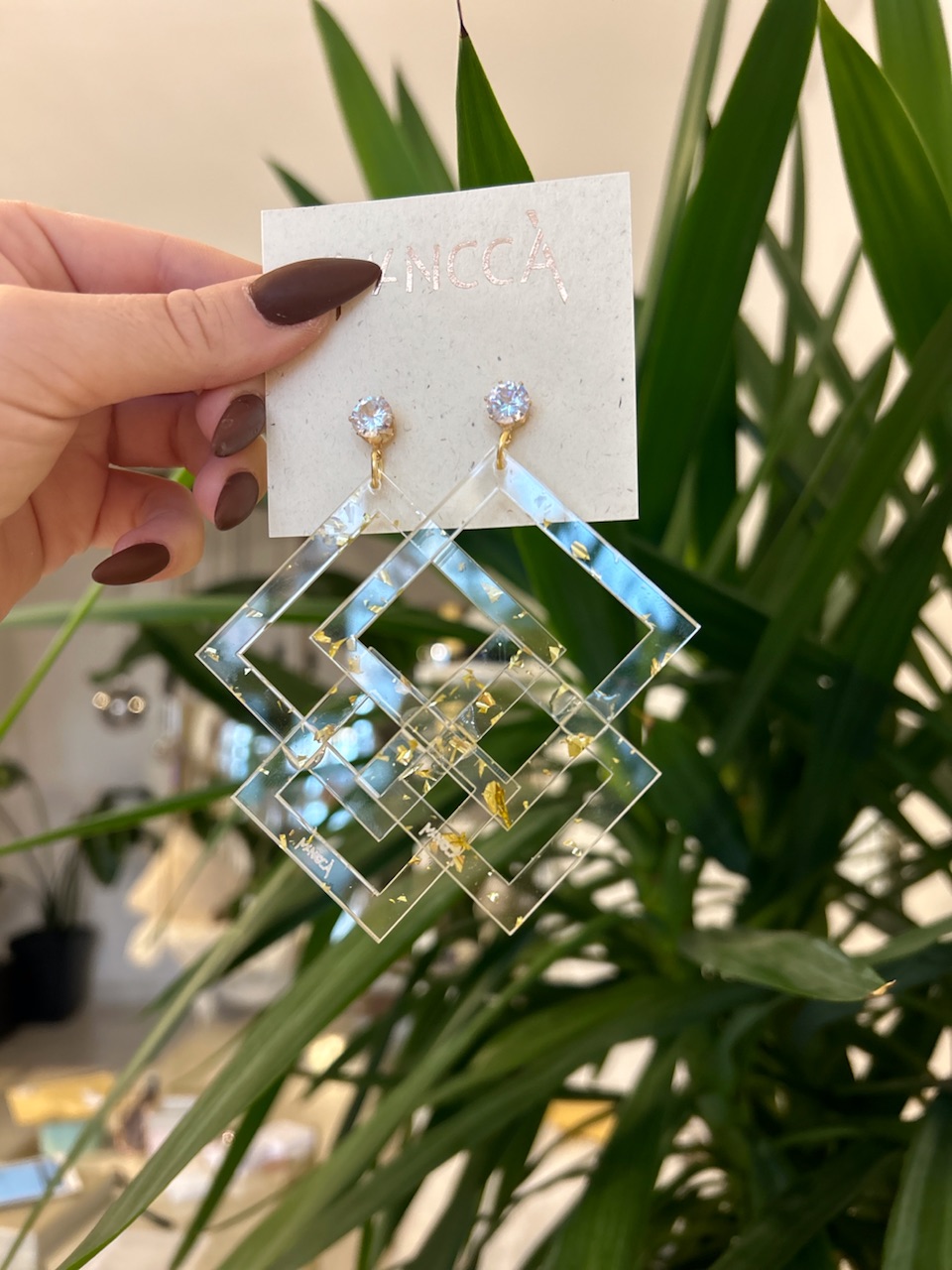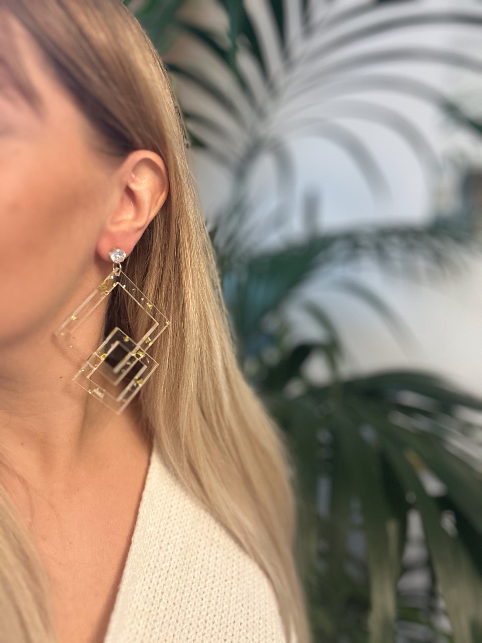 Uhani iz THE square kolekcije – prozorni uhani z vgrajeneimi zlatimi lističi v obliki dvojnega kvadrata za vsak dan ali posebno priložnost. Enostaven design in odbit look. Statement kos, ki paše na prav vsak stayling. Že veš kam jih boš kombinirala?