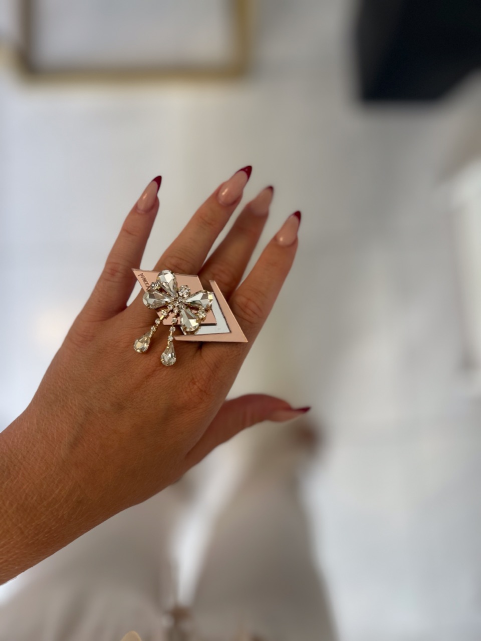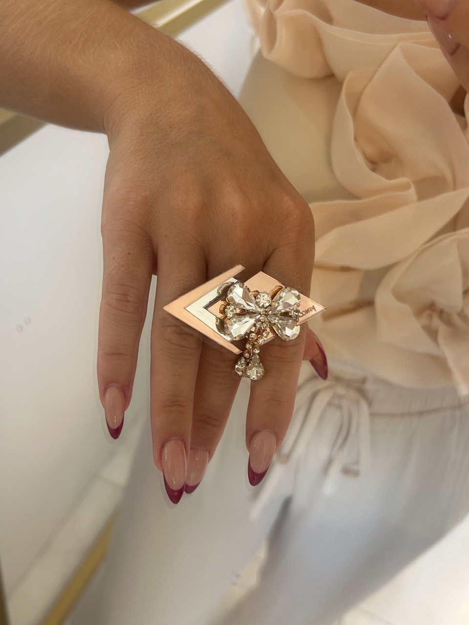 Prstan na plastenju mirror srebrne in rosegold pleksi stekla s kristalnim dodatkom v obliki pentlje, v silver kombinaciji kristalov, namenjen ljubiteljicam čistih linij in prefinjenosti. Prstan je po dolžini velikosti cca 6 cm.