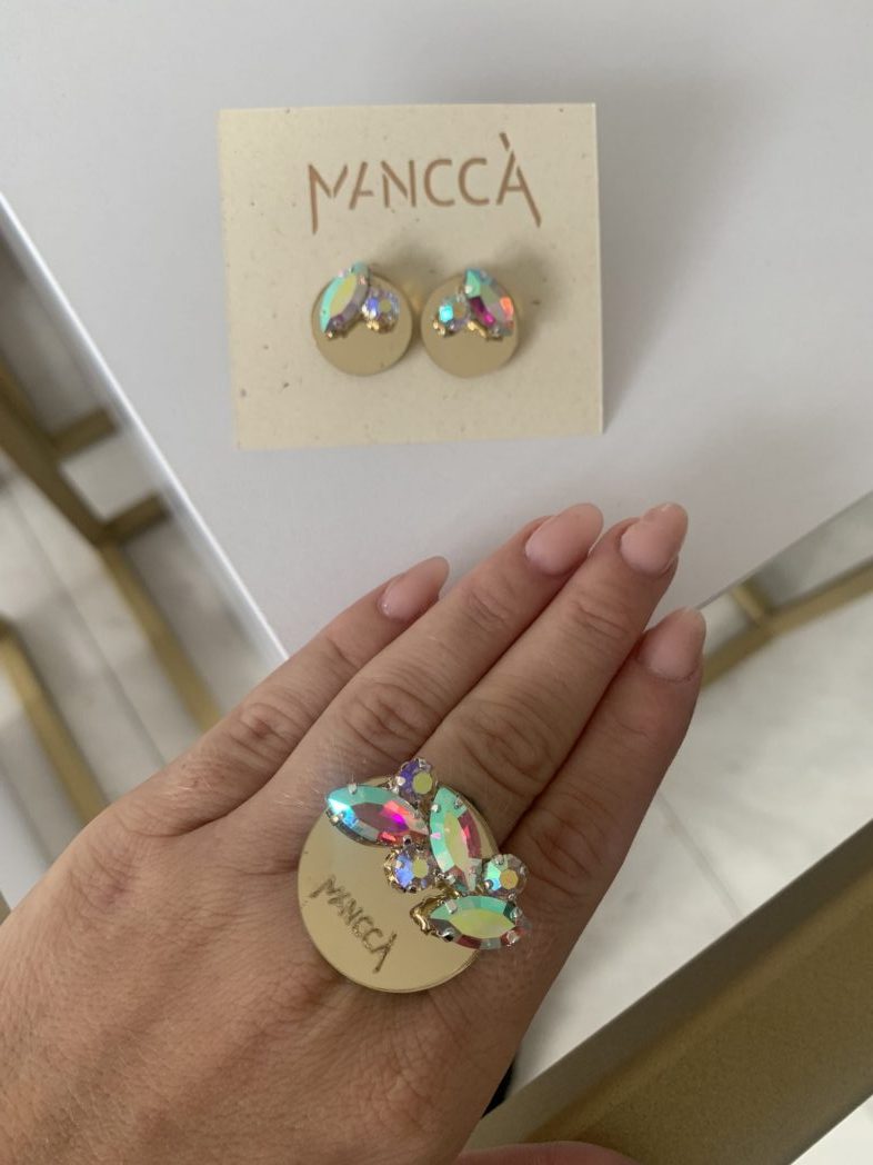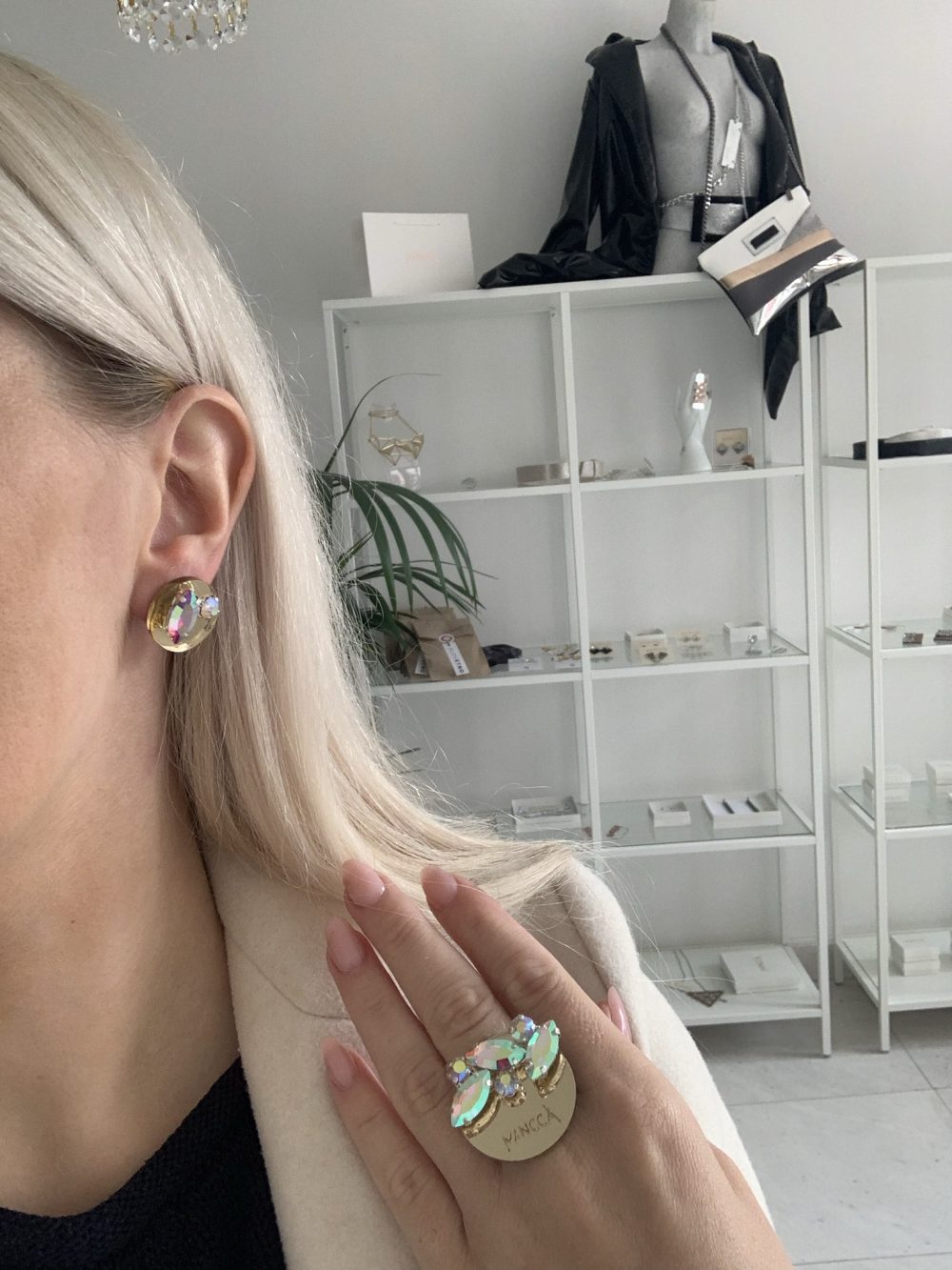 Komplet Crystal je sestavljen iz uhanov na mirror podlagi v kombinaciji z večjimi barvnimi kristali in prstanom. Želiš biti drugačna? Potem je tale komplet narejen zate. Izstopaj in izrazi svojo unikatnost. Dodaj svojemu outfitu piko na i.