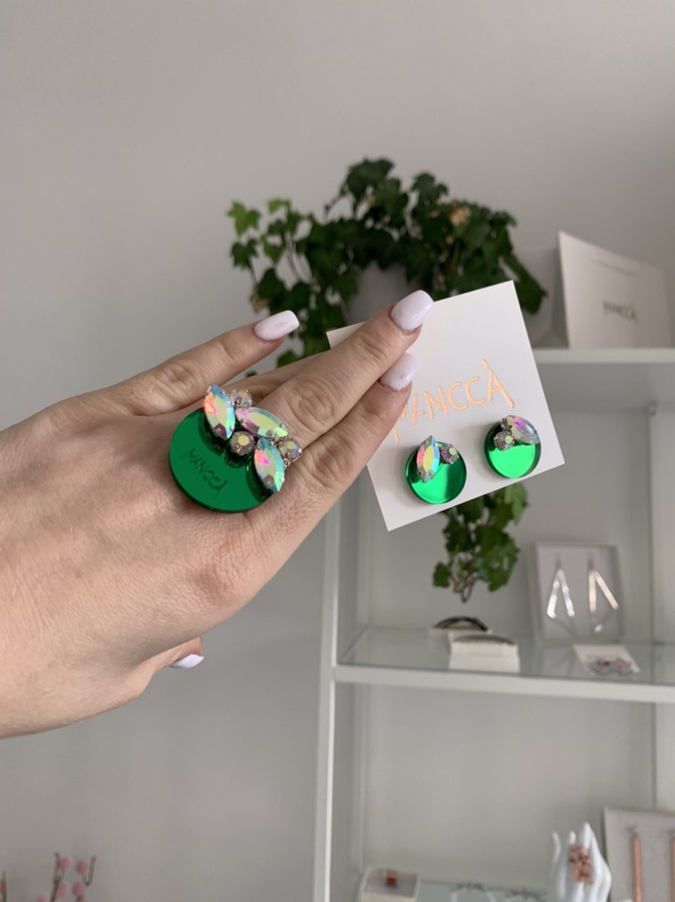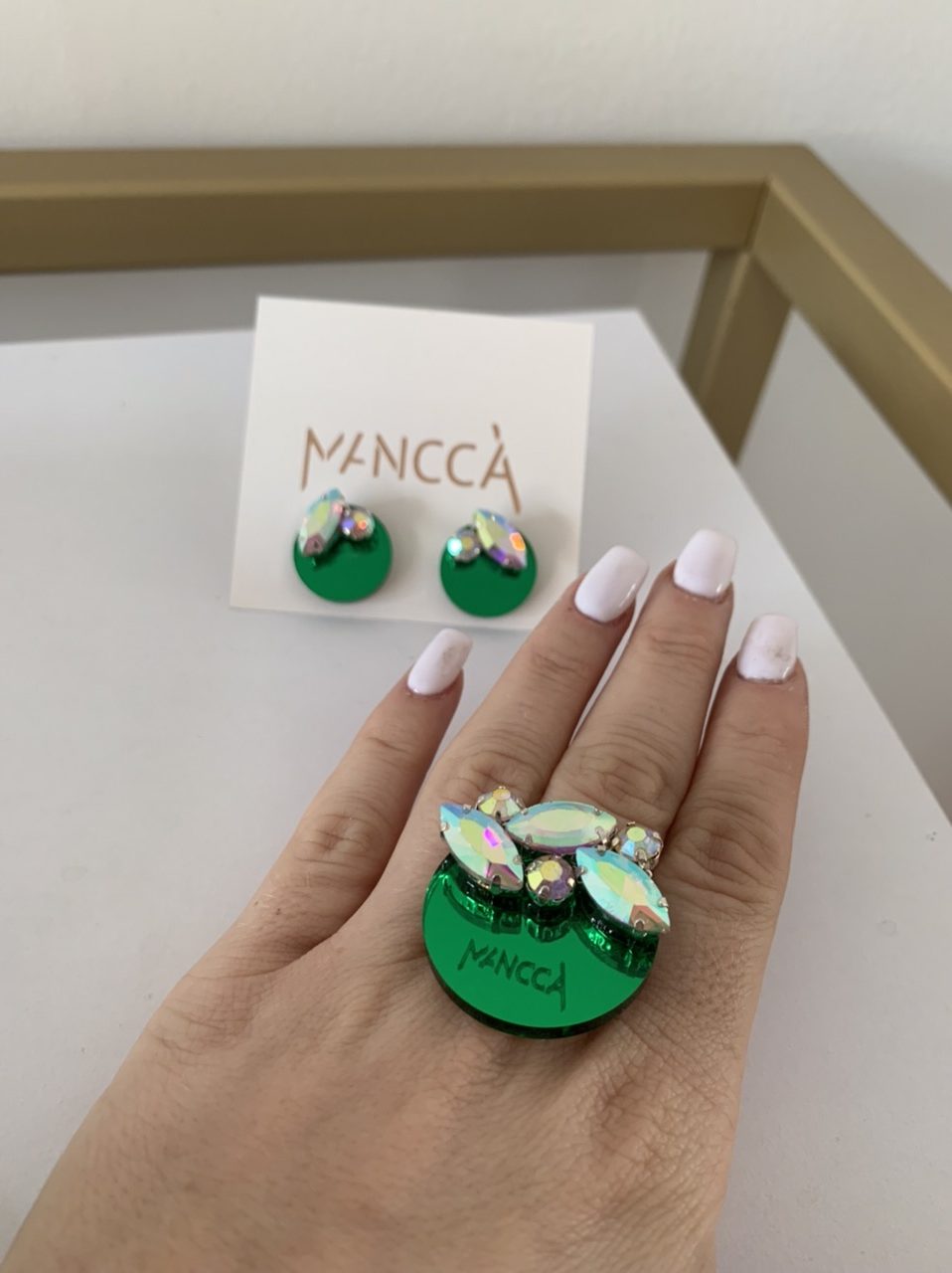 Komplet Crystal je sestavljen iz uhanov na zeleni mirror podlagi v kombinaciji z večjimi barvnimi kristali in prstanom. Želiš biti drugačna? Potem je tale komplet narejen zate. Izstopaj in izrazi svojo unikatnost. Dodaj svojemu outfitu piko na i.