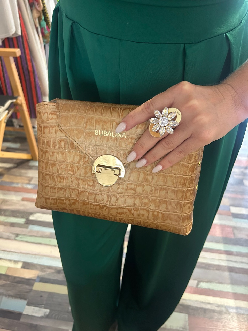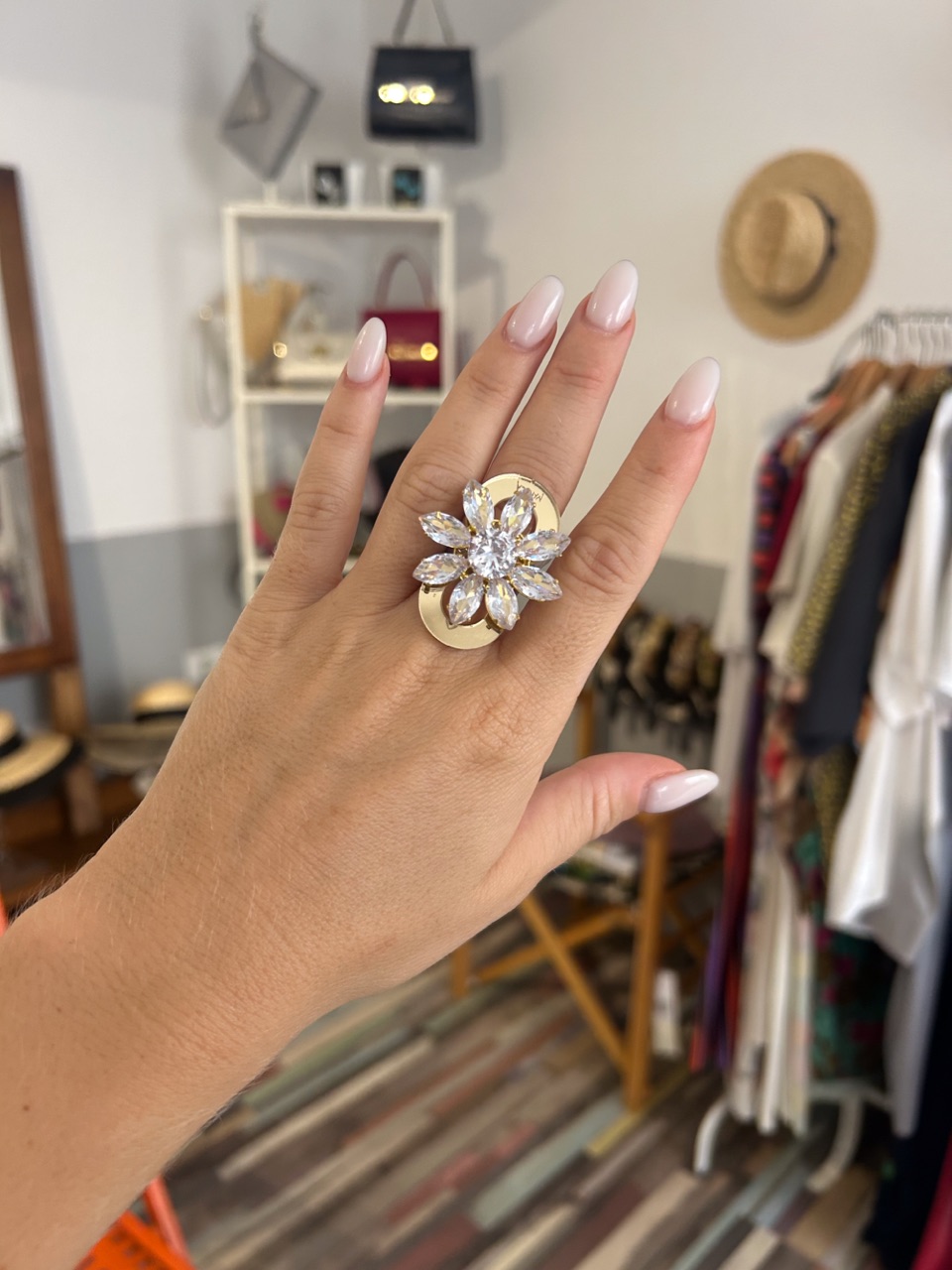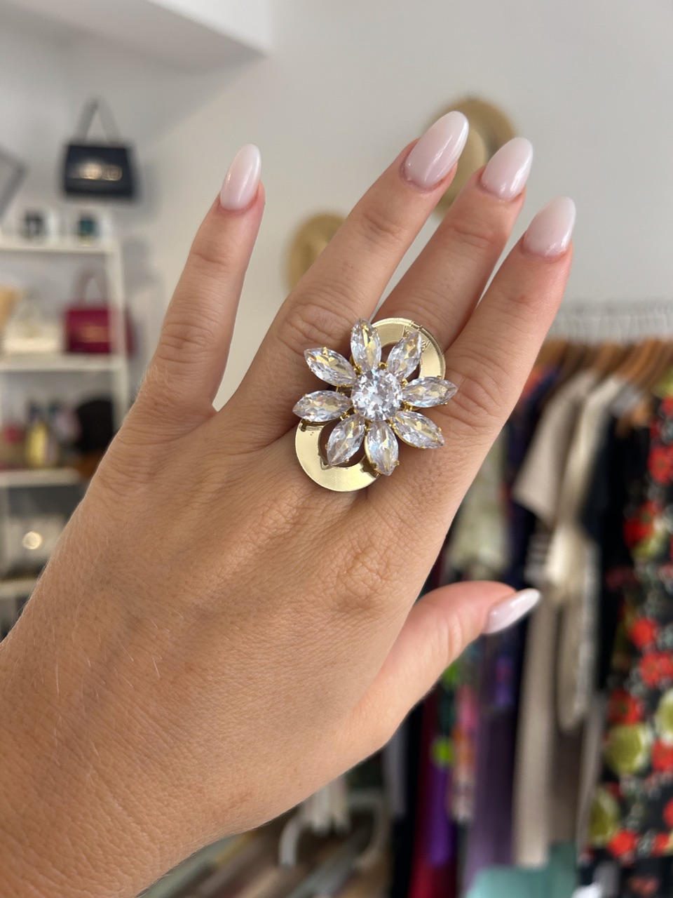 Prstan s kristali, namenjen ljubiteljicam okroglih linij. Primeren za vse barvne kombinacije in dodatke. Prstan je velikosti cca 4cm in vas zagotovo ne bo pusti neopažene .
