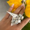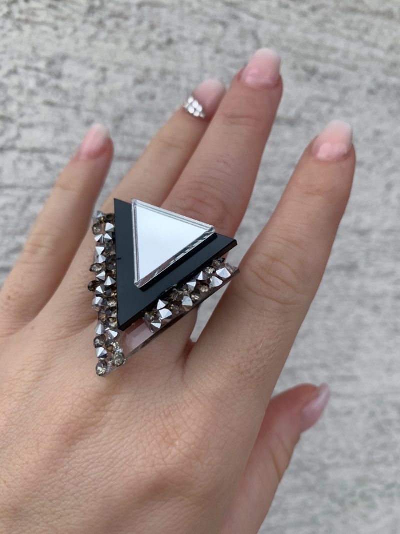 Črn in mirror srebrn prstan na transparentni podlagi, je kot nalašč za garderobo z umirjenimi toni. Kljub nevtralni barvi, izstopa z unikatnim dizajnom in kančkom kristalov. Bodi drzna in si privošči drugačen kos nakita.