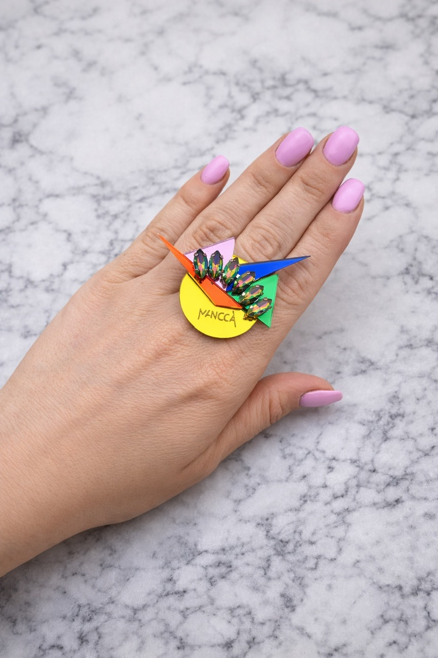 Kombinacija živih barv, deluje zelo kraljevo! Prstan je kot nalašč za top stajliš kombinacije. Nor in eleganten statement kos, ki bo gotovo požel ogromno komplimentov. Izstopa z unikatnim dizajnom in kristali. Bodi drzna in si privošči drugačen kos nakita. Nora kombinacija je kot nalašč za pomladne in poletne stajlinge. Premer 3,5cm.