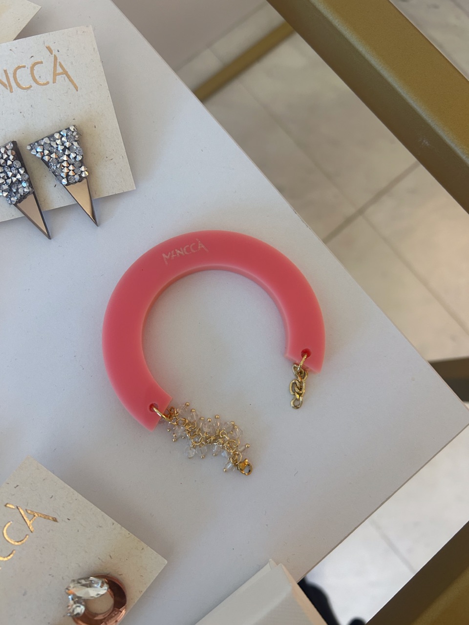 Material: Galvanizirana veriga in pleksi plošča debeline 6mm, z dodatkom kristalne verige. Občutljivo na parfum in vse kar vsebuje sledi alkohola.
